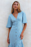 Simple yet charming Donna midi dress screams elegance and femininity. Handcrafted from soft breathable rayon into button down silhouette with smock waist on the back and fitted detailing on the front it cascades into a tiered skirt and is adorned with tortoise buttons and butterfly sleeves.