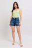 Double button waistband denim shorts feature a unique design with two buttons at the waistband for added style and security. These shorts provide a flattering high-waisted fit and are a versatile option for creating different looks. They are a fashionable choice that offers both comfort and style for various occasions.